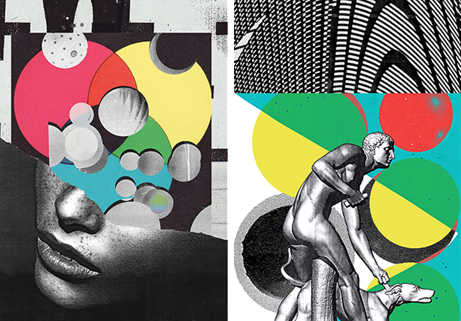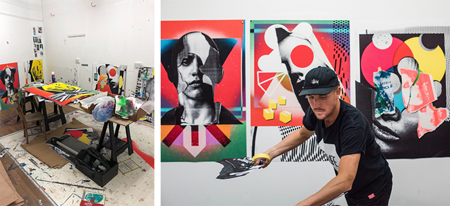 膨大な量の古本や古雑誌を収集していて、そこからさまざまなビジュアルをピックアップし、再構築してコラージュを完成させる。コラージュは何層にも重なったコラージュの上に、さらにテクスチャーや色ものせて仕上げていくという。