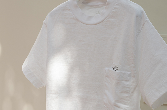 坂田 モックネック風にしてあって、ちょっと詰まっていたほうがかわいいし、よれてきたときもいい感じかなと。ミリタリーのタグを胸ポケットの内側につけたのは、しゃれというか、まあデザイナーとしてのこだわりです。白いTシャツなんて世の中にたくさんあるから、値段がどうとかではなく、存在価値のあるものにしたかった。たとえば、アメリカのTシャツって、二本針のステッチなんですけれど、あえて90年代のすくい抜いのシングルステッチにしてみたり。そういう細かいところにこだわって、まったくインスタ映えしないTシャツになりました(笑)。いいでしょう?そんなにフォロワー増やさなくても(笑)。