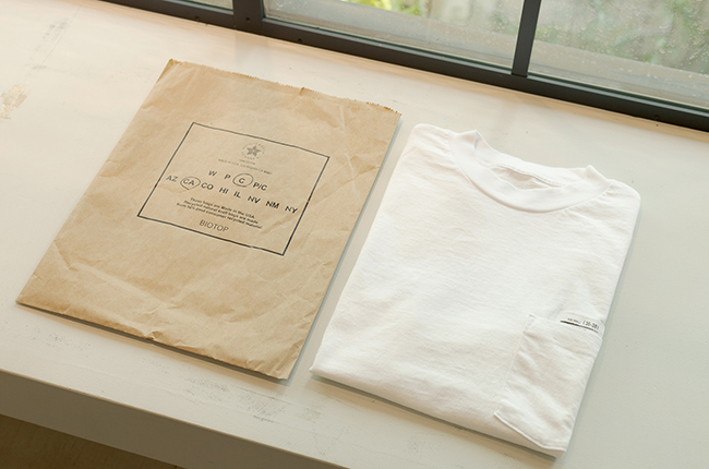 坂田 シンプルなものって作るのが難しいんですよ。サイズ感、生地、ステッチ、バランス、それぞれに何かこだわって作らないと、最高のシンプルは成立しない。それで参考にしたのはミリタリーのTシャツ。軍から支給されるものなので、何年にどこで作られてサイズはいくつとタグにプリントされているんですが、デッドストックを世の中に出すときはその情報をマジックで消すんです。その無造作な感じがなんだかかっこいい。タグはテキサスでしか作れないので、わざわざテキサスの会社にオーダーしました。そうやってひとつひとつこだわって作らないと、BIOTOPに置くのにふさわしい商品にはならないと思ったので。結果、かなり満足のいくものになりました。