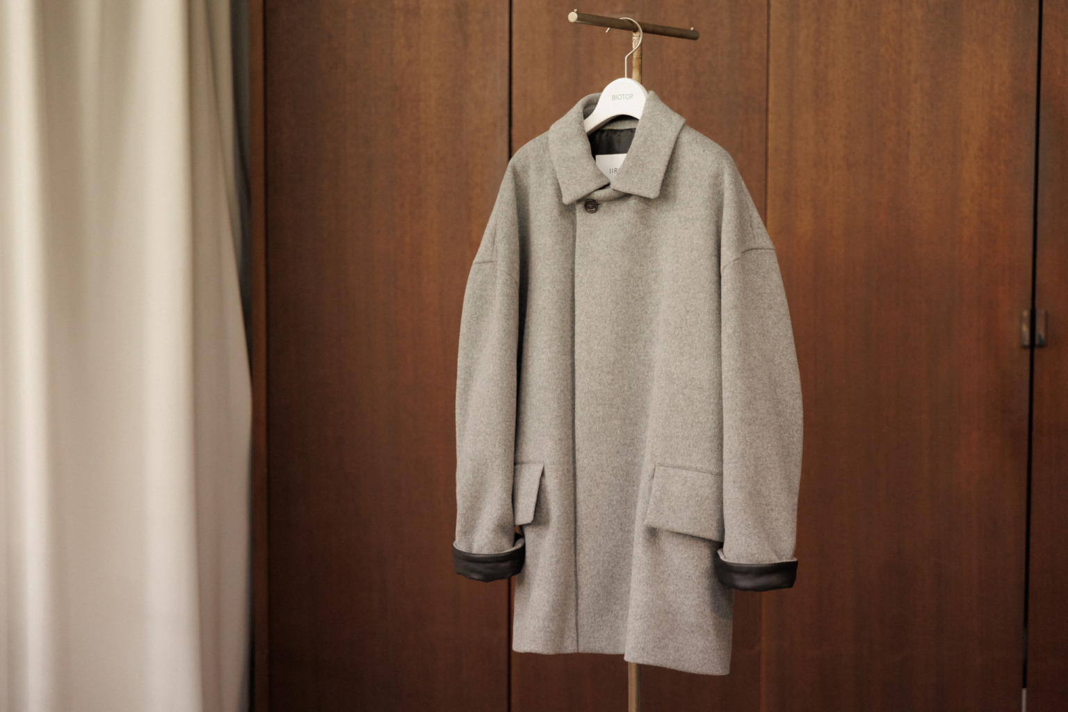 BIOTOPがIIROTに別注したステンカラーコート。カシミヤ混のSuper’100ウールにリバービーバー加工を施した素材が軽くて着心地抜群。袖と襟の裏のブラックレザーがポイント。11/10(金)より、BIOTOP大阪店で発売。¥85,800