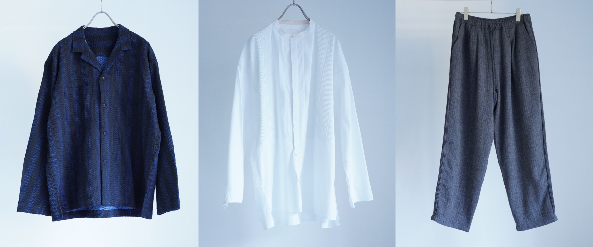 <左>デニム刺し子シャツ(PHUN-SH3)¥93,500 <中>オーガニックコットンシャツ( Trinity )¥36,300 <右>ウールパンツ( Jones )¥49,500/以上Pheeta(BIOTOP)