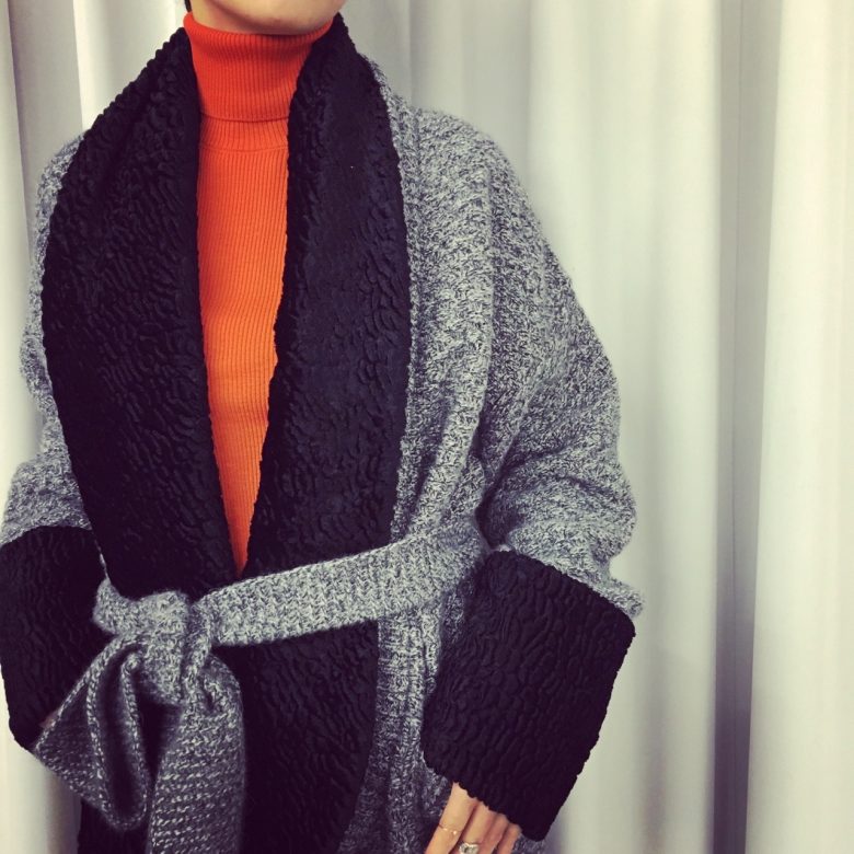 あえてカラーと袖は重たい生地が使われており、エレガントな印象。