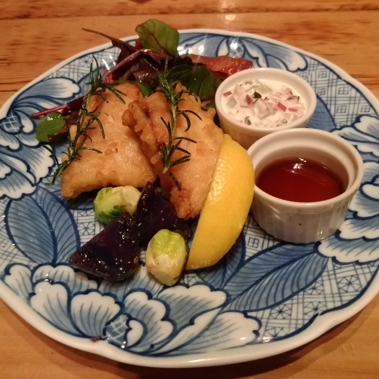 “ 真鱈のフリット オーガニックリーフサラダと紫芋の炭火焼添え”