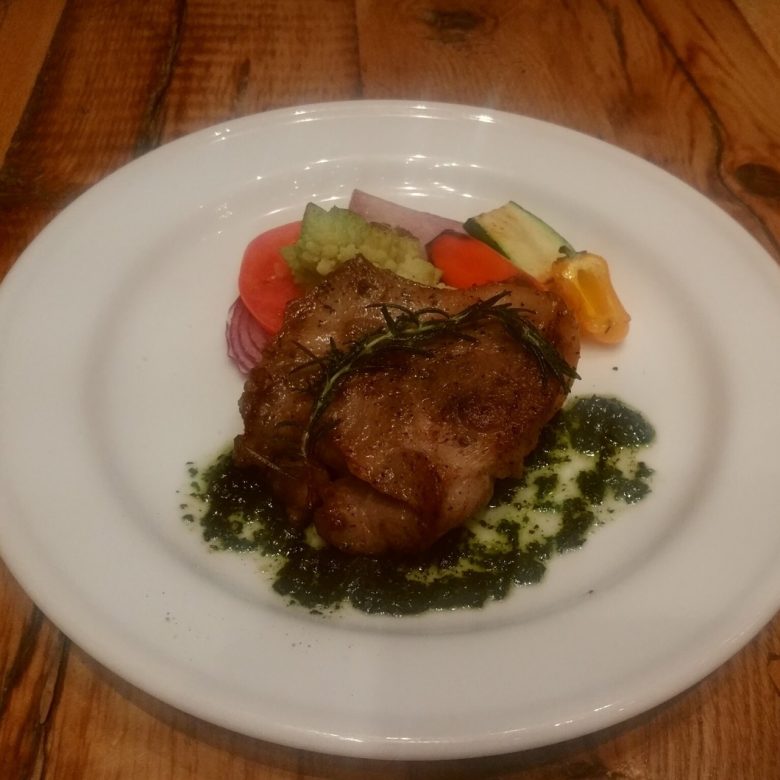 こちらは今週の週替わりランチメニューから"上州もち豚の肩ロースのスパイシー炭火焼 “です。炭焼き有機冬野菜添えで、野菜から冬を感じられます。Spicy Charcoal Grilled MOCHI Pork Chimichurri Sauce with Grilled Organic Winter Veges