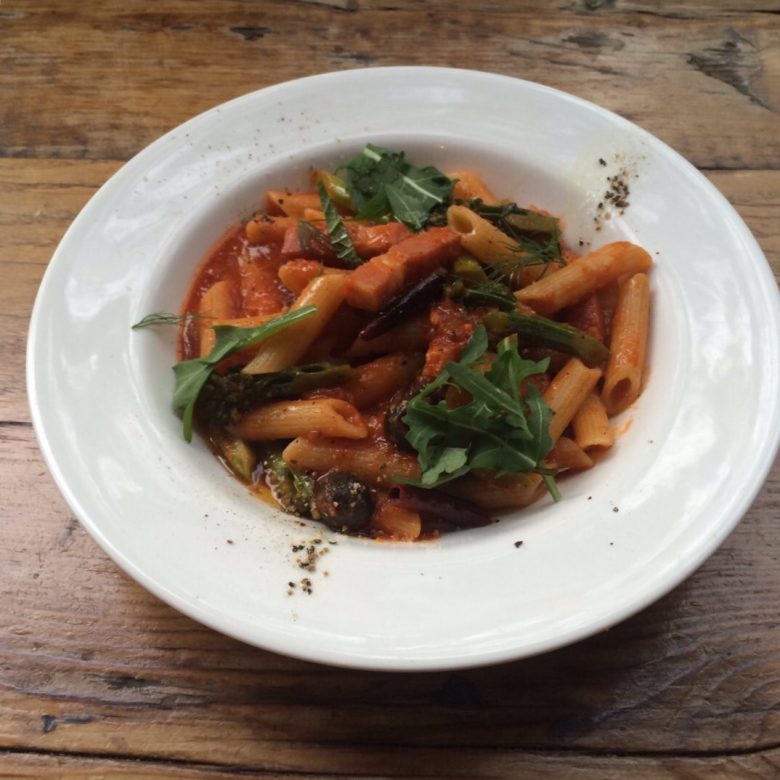 今週のランチパスタから"イベリコベーコンとスティックセニョールのアラビアータ ペンネ"です。