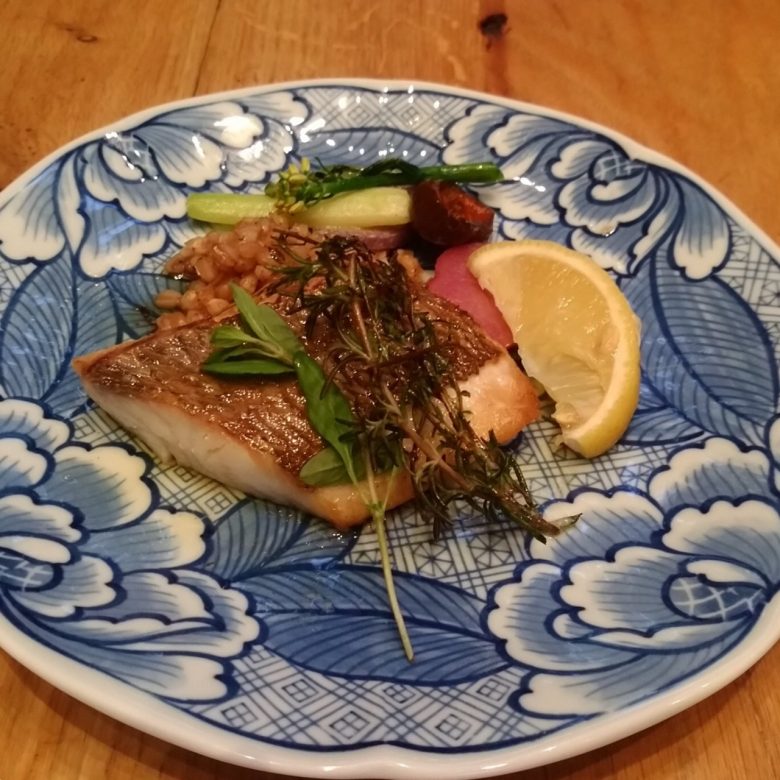 今日は、今週のランチから"真鯛のハーブマリネ炭火焼"のご紹介です。スペルト小麦と有機野菜添え&パン付きで、サラダバーもSETになっています。