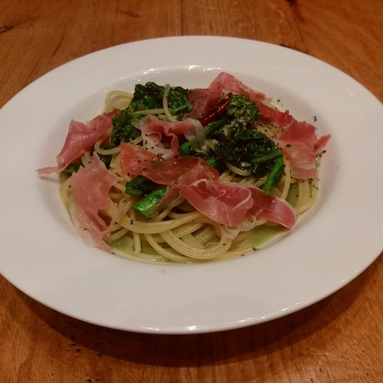 今日は今週のランチパスタから"生ハムと菜の花のジェノベーゼスパゲッティ"のご紹介です。