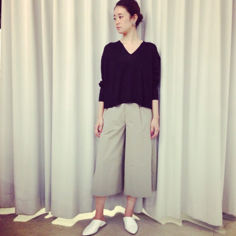 トップスの編み地の面白さと、パンツの絶妙なカラーがポイントです。