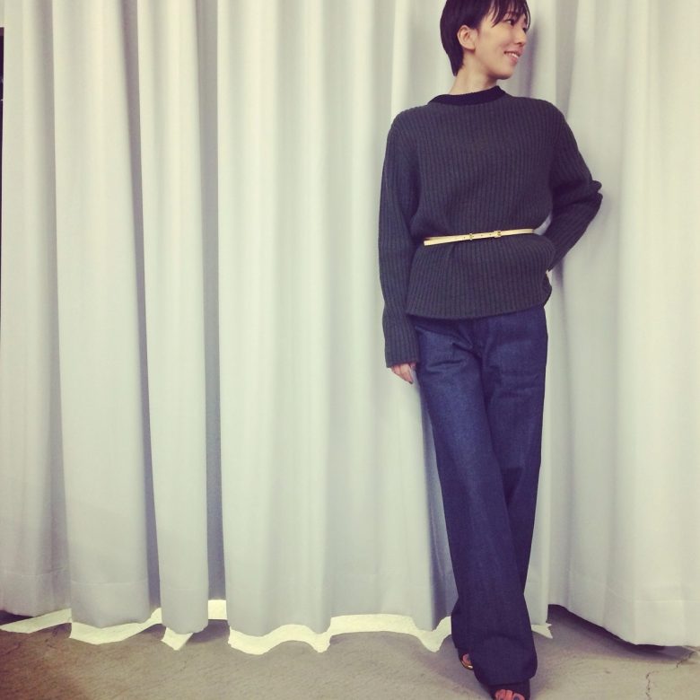 ゆったりとしていて着丈長めのアイテムは細いベルトでウエストマークが今の気分。