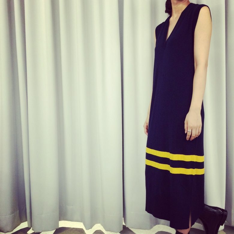 06.08.2015 イエローラインがポイントのワンピースは、ハイゲージのウールで着易い生地感に。 dress T-by ALEXANDER WANG ¥47,000+tax tbyalexanderwang