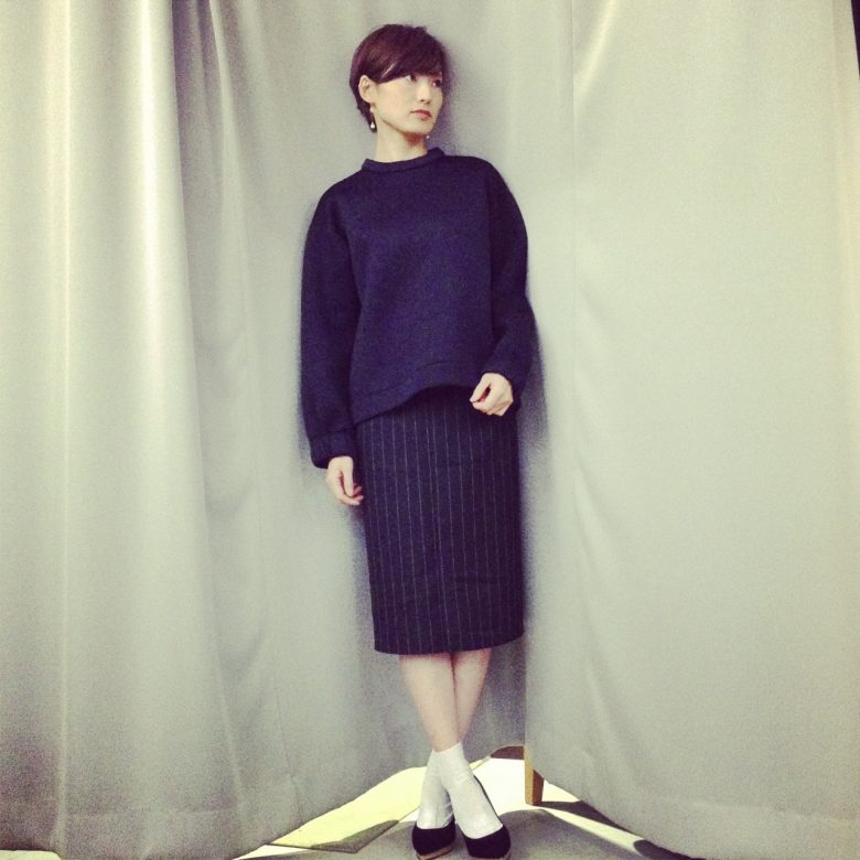 ウェットスーツのようなお素材のトップスは、キレイめアイテムと組み合わせると◎