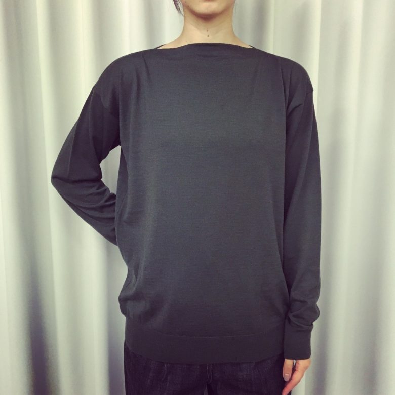 ウールカシミア素材で肌あたりの良いニットは、ボートネックですっきりとした印象に。