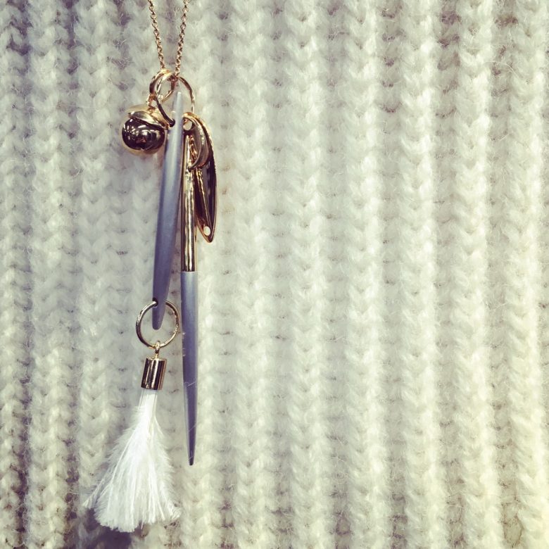 オーストリッチのフェザー×マルチシェイプペンダントが揺れるネックレス。
