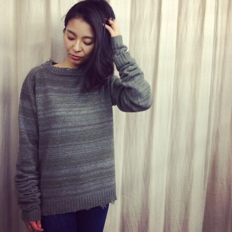 カシミヤ混のダメージニットは、程よい厚みで柔らかく着心地も◎