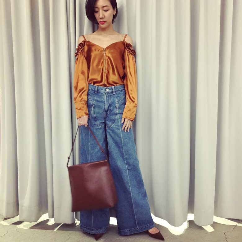 カッパーオレンジが目を引くシルクサテンブラウスは、今年取り入れたいオフショルダー仕様に。