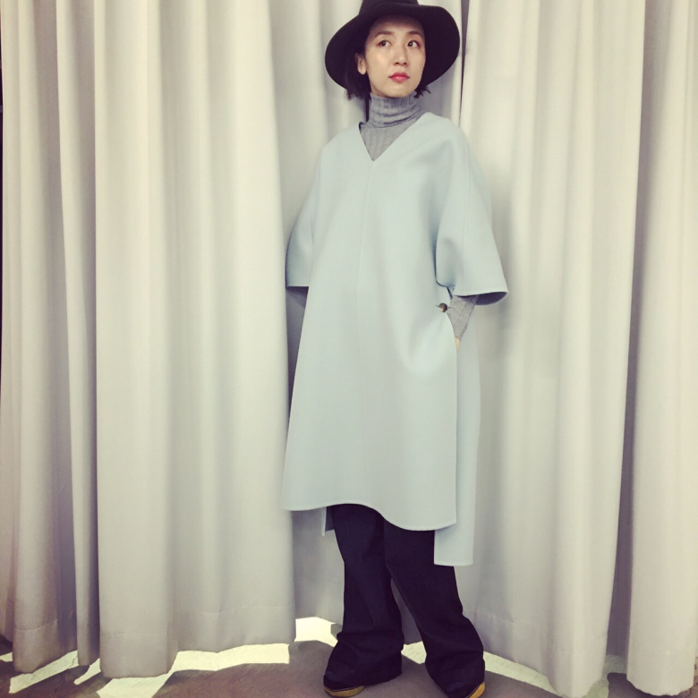 TOKYO 16.10.2016 カフタンポンチョはひじょうに柔らかいウールビーバー素材なのでしなやかで軽やか。 肩肘張らずにさらりとお召しいただけます。 MADISONBLUE col…sax size…00 ¥132,000+tax 16aw madisonblue maisonmichel WEAR