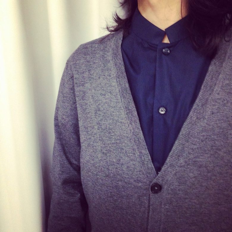 カーディガンとシャツで襟元に変化を加え一枚でも着回しがききます。