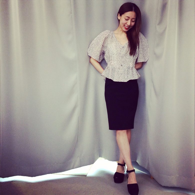 ガーリーなパフスリーブのブラウスを辛口コーディネートで…♡