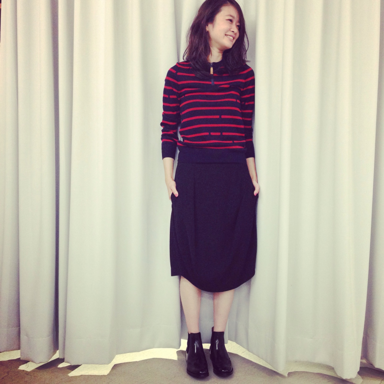 コンパクトなシルエットのボーダーニットは少しシックにまとめて大人カジュアルに。