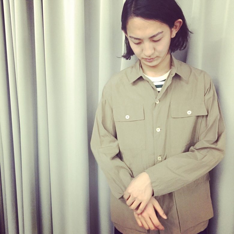 シャツ生地を使用することにサファリジャケットとは違う軽い着心地とシワ感が特徴です。