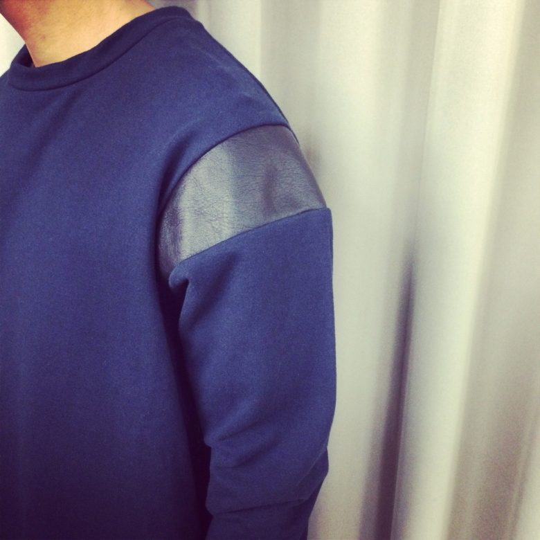 ショルダー部分にはレザーの切替で遊びを効かせて。