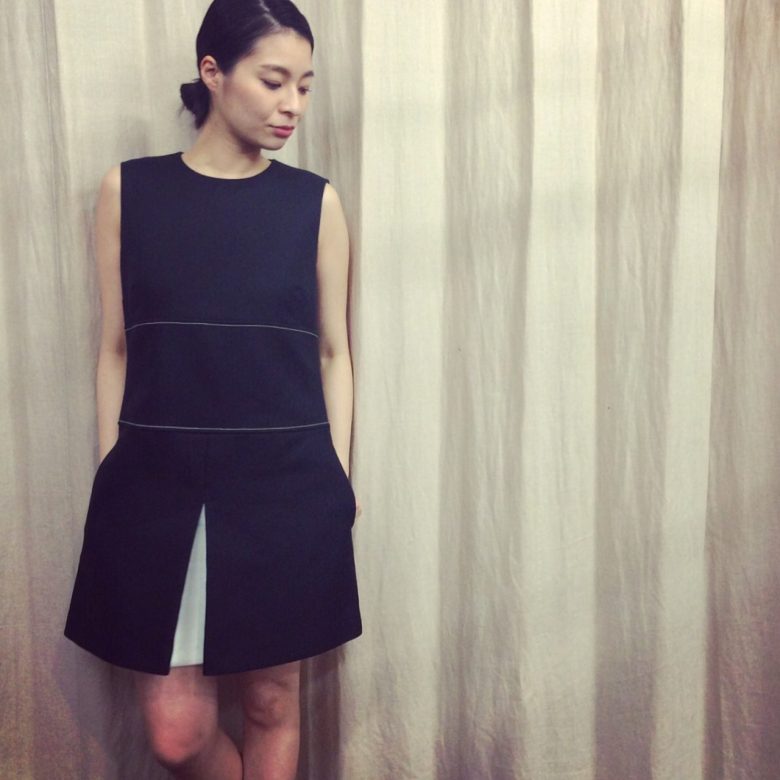 シンプルなミニドレスもwhiteステッチのラインですっきりと上品に。