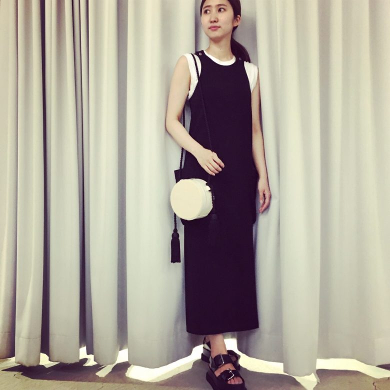 ジャージー素材のロングワンピースにサンダルで、モノトーンのコーディネートも程よくラフに◎オーバーサイズのポケットも目を惹きます!