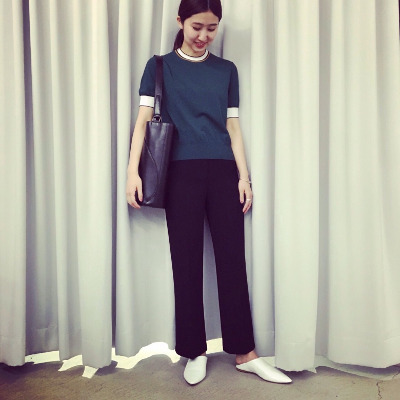綺麗なスラックスに合わせてマニッシュにスタイリング。