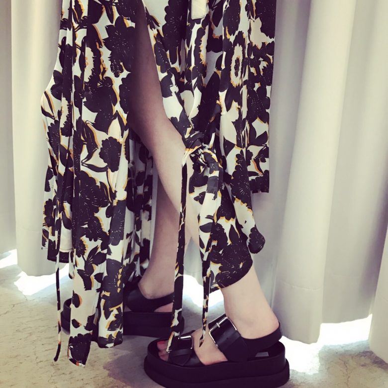 スリットやギャザーがアシンメトリーなシルエットを構築します。