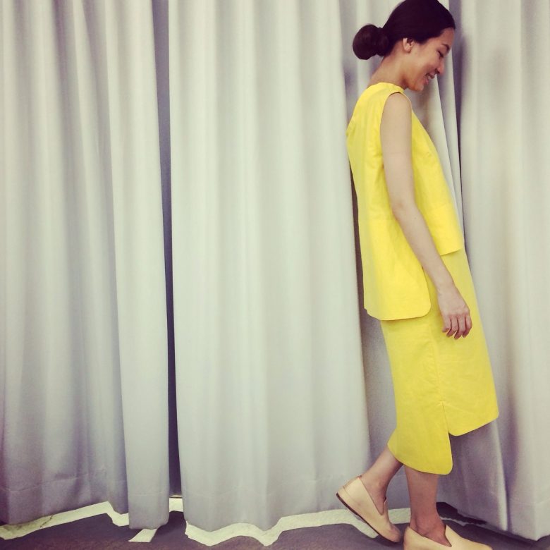 ビビッドなイエローをすとんとしたシルエットでシックな印象。