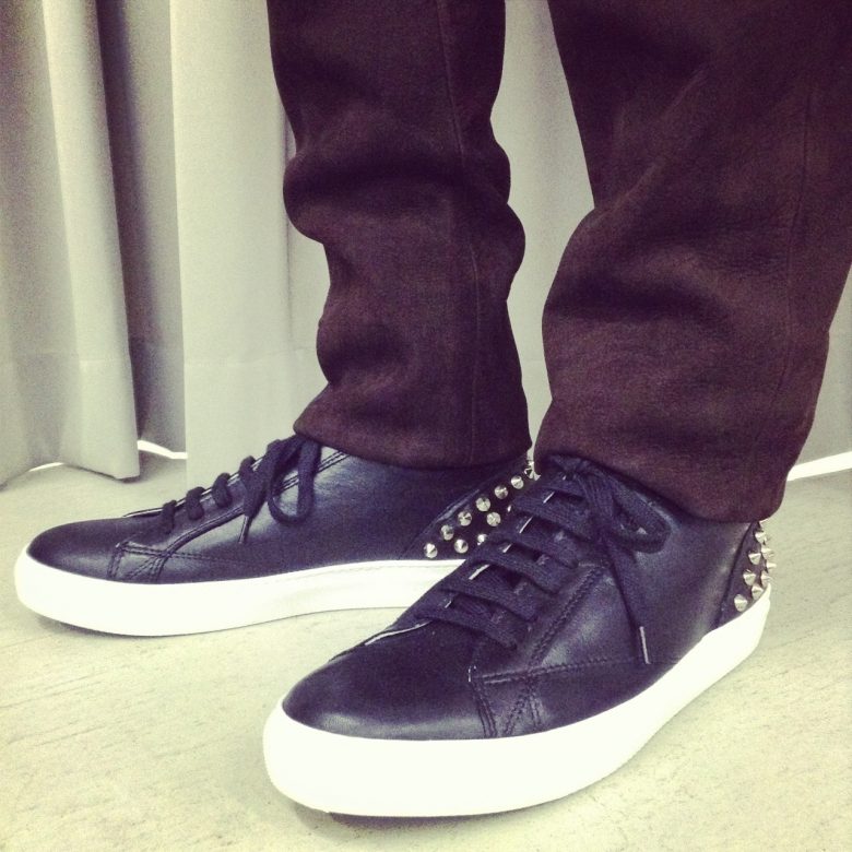 タートルネックの足元は、あえてハードにスタッズスニーカーで是非。
