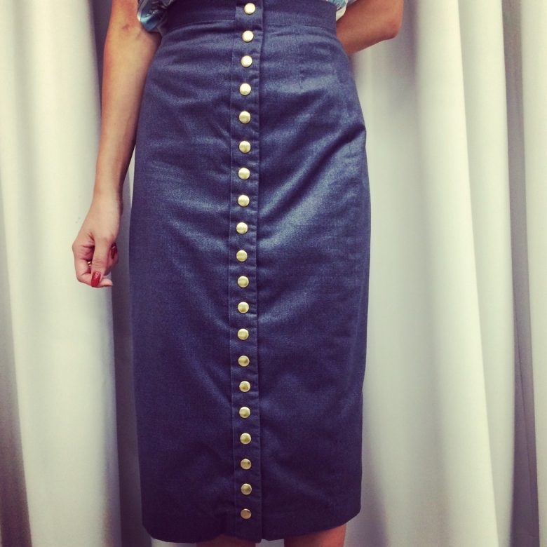 デニムのような雰囲気でありながら、ヴェルヴェット地で品のあるレディライクなタイトスカート。