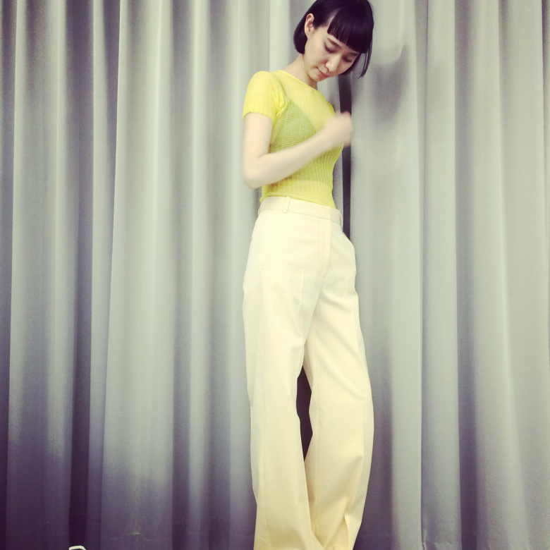 トップスの透け感もイエローカラーならクリーンに着こなせます。