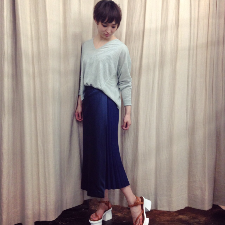 トップスはリネン、スカートはサテンと