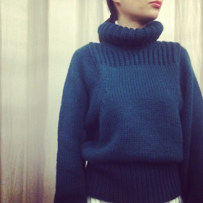 ドロップショルダーで縁はリブ編みに。