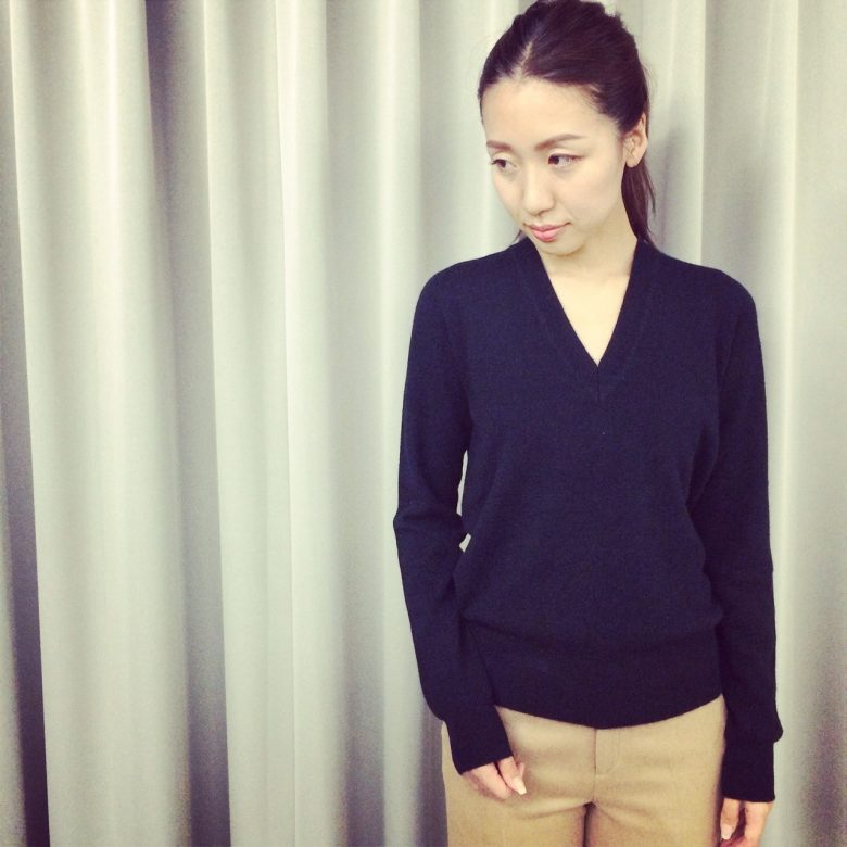 ネックの同系色のラインでさりげなくユニセックスに。スカートにも合わせて着たいです!