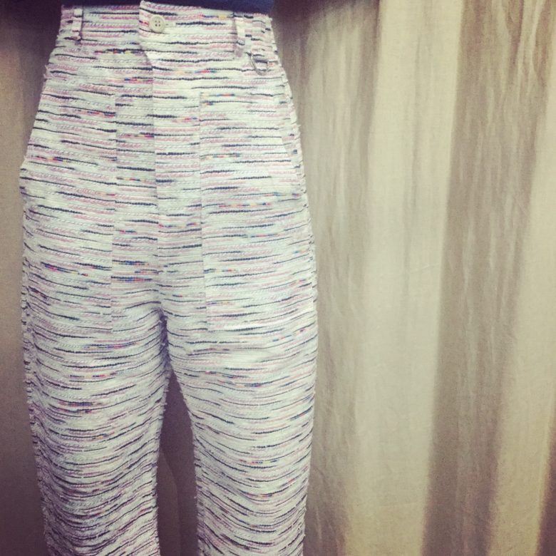 ハイウエストで、異素材をミックスさせた生地がポイントに♪