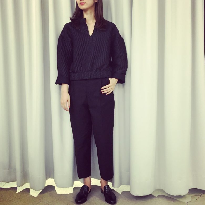 ハリ感のあるトップスでオールブラックのスタイリングも、素材感の違いを楽しめます。