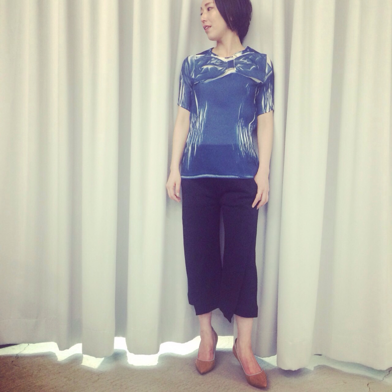 バストのリボンが華やかに際立つtopsは、生地の染め方も独特。