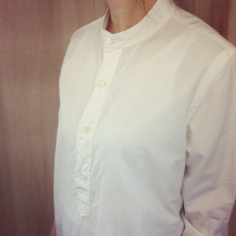 バンドカラーのタイトなシルエットのシャツワンピース。ボタンを閉めて、首周り詰まったバランスも素敵です。