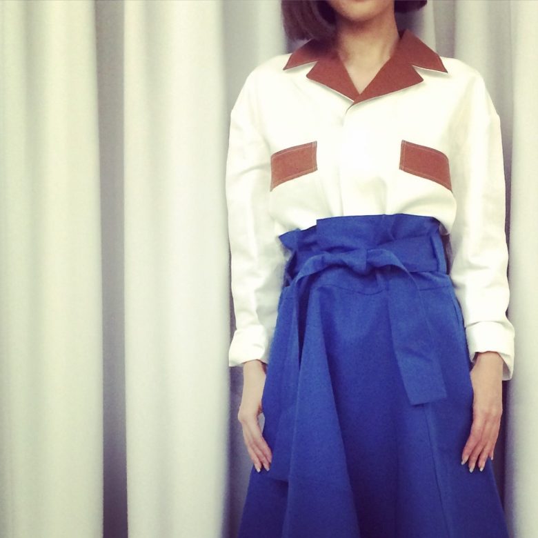 ブラウン×ホワイトカラーでコントラストが効いた一着。