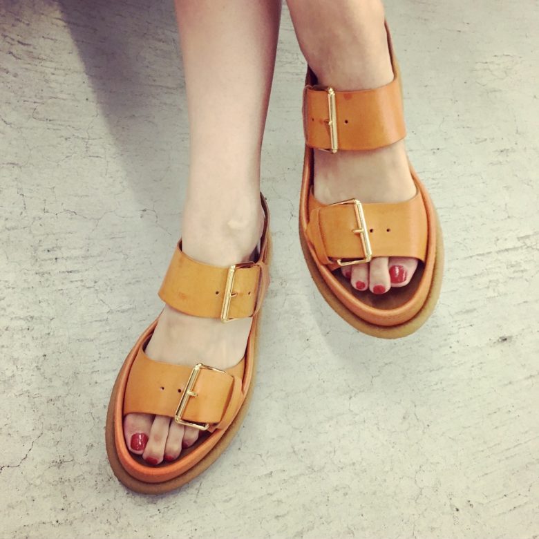 プラットフォームのサンダルは、程よいボリュームがコーディネートのアクセントに。