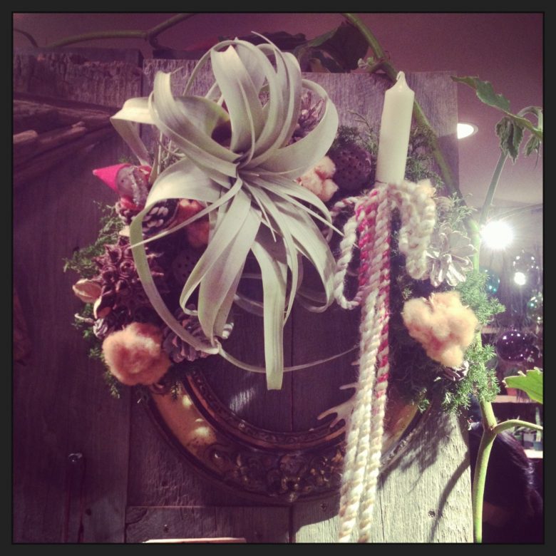 アンティークの額を使った、ほかにはないリース。左上のサンタさんがかなりかわいいです。¥12600