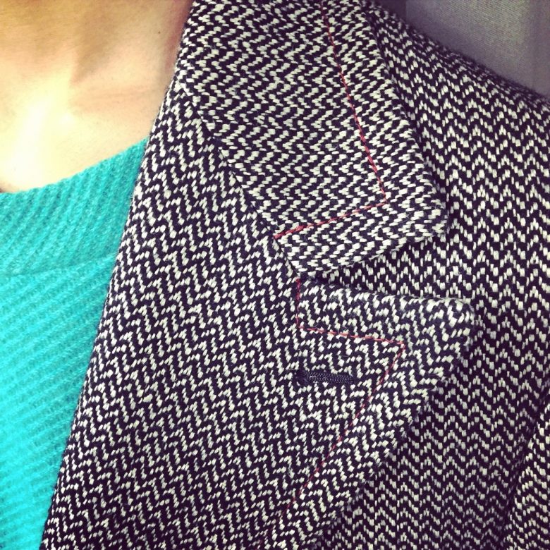 ヘリンボーンの生地感と赤ステッチが特徴となってます。