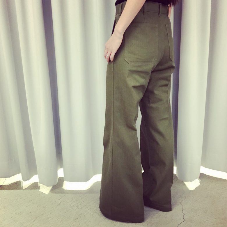 ベイカーパンツはヘリンボーンの生地を使用し、上品な仕上がりに。