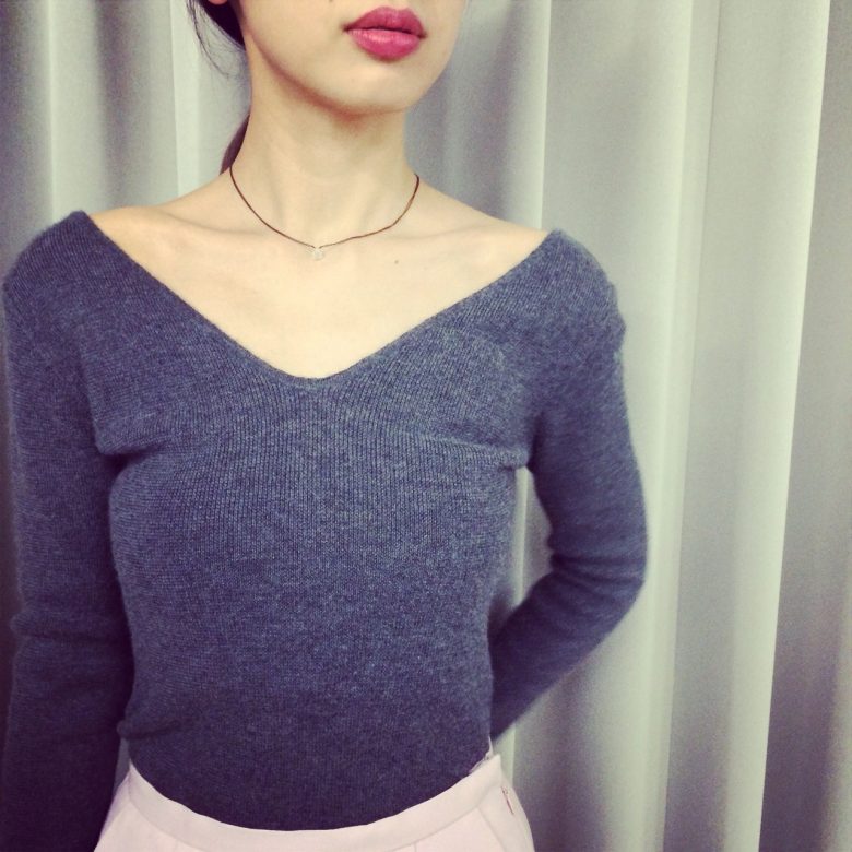 ボディスーツ型のカシミアニットはVの開きがデコルテを美しく演出してくれます。