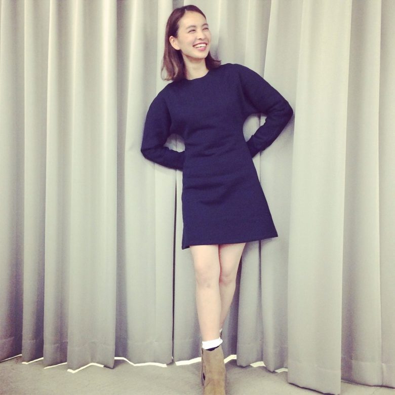 ボンディングのスウェットワンピース。スカート部分はタイトめなAラインで女性らしく◎