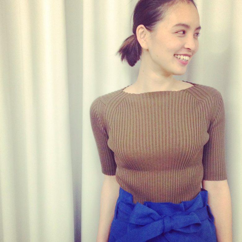 ボートネックが首元をすっきりと見せてくれるニット。