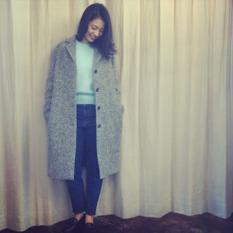 マルチカラーの暖かい色目が魅力的なコート。女性らしい印象に。