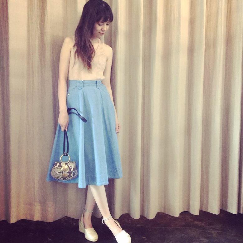 ミモレ丈のデニムスカートで、夏のスタイリングも女性らしくカジュアルに♪